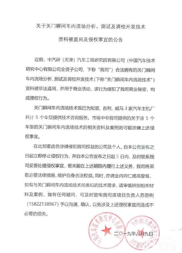 關于關門瞬間車內流場分析、測試及調校開發技術資料被盜用及侵權事宜的公告