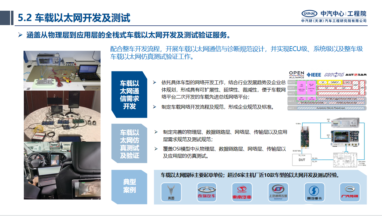 中汽中心工程院電子電氣架構與先進總線團隊在車載以太網開發及測試服務領域具有技術實力和豐富的項目經驗。依托具體車型的網絡開發工作,結合行業發展趨勢及企業總體規劃,形成具有可擴展性、延續性的規范企業規范及標準體系,便于車載網絡平臺二次開發的車載先進總線網絡平臺,制定車載網絡開發流程及規范。配合整車開發流程,制定完善的物理層、數據鏈路層、網絡層、傳輸層以及應用層需求規范及測試規范;覆蓋OSI模型中從物理層、數據鏈路層、網絡層、傳輸層以及應用層的仿真測試。測試內容包括物理層PMA和IOP測試、交換機性能測試、TC8協議一致性測試、AVB/TSN協議測試、基于診斷DoIP的診斷協議測試和BT刷寫測試、路由測試等。