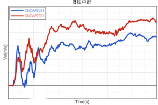 2024版C-NCAP正碰工況由50km/h速度提升到了不低于55km/h碰撞速度。碰撞總能力提高了20%。這對前艙結構吸能提出了更大的挑戰。下圖是采用滿足2021版C-NCAP正碰開發需求的車型,進行2024版C-NCAP正碰分析對比結果??梢钥闯?,碰撞速度提升后,前艙被擠壓的量更大、前圍入侵超過了100mm,B柱加速度提高了10g。因此2021版C-NCAP正碰結構設計,并不能滿足2024版C-NCAP正碰開發需求。