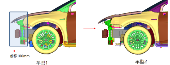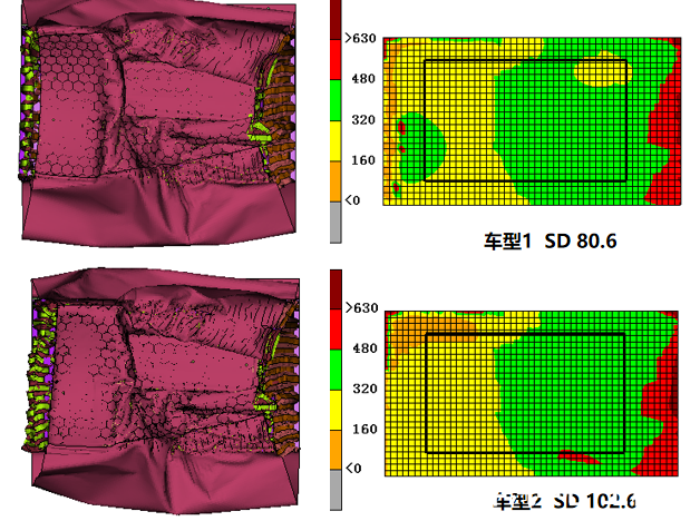 下圖是兩款不同結構車型的SD計算結果,其中車型1為含副車架傳力結構,車型2為不含副車架傳力結構??梢钥闯觯黾痈避嚰軅髁νǖ篮螅琒D指標可以從100mm降至80mm,改善效果非常明顯。