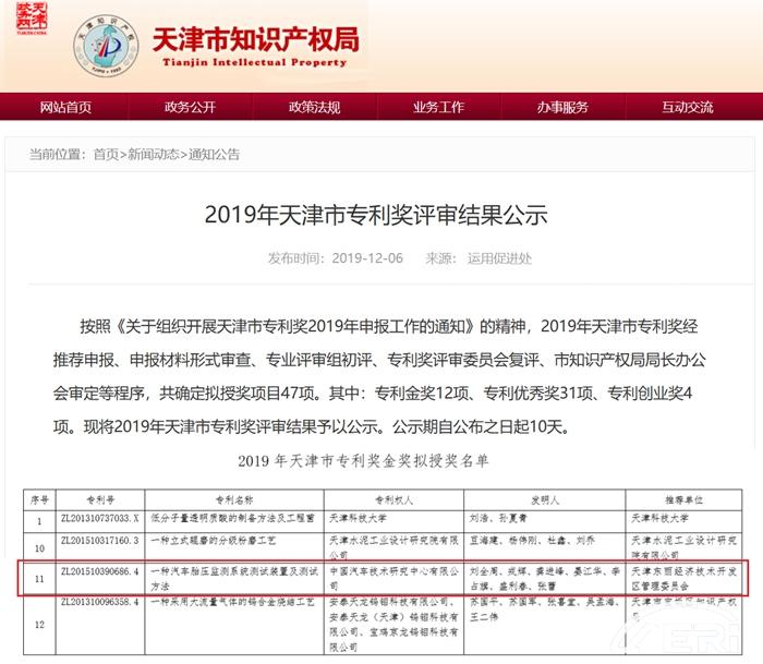近日,天津市知識產(chǎn)權(quán)局公布了《2019年天津市專利獎(jiǎng)評審結(jié)果》,中國汽車技術(shù)研究中心有限公司(以下簡稱“中汽中心”)發(fā)明專利“一種汽車胎壓監(jiān)測系統(tǒng)測試裝置及測試方法”榮獲天津市專利金獎(jiǎng)。