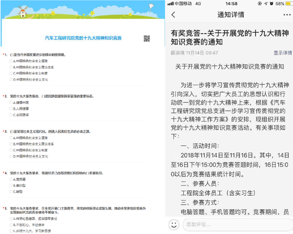 本次競賽活動(dòng)充分發(fā)揮網(wǎng)絡(luò)平臺優(yōu)勢,利用APP實(shí)現(xiàn)電子答卷,員工可以在手機(jī)或者電腦上點(diǎn)擊鏈接進(jìn)行答題。網(wǎng)絡(luò)競賽形式打破了傳統(tǒng)現(xiàn)場競賽的時(shí)間、地點(diǎn)限制,大大提高了員工參與率。在題目設(shè)置上,重點(diǎn)突出黨的十九大精神和新黨章的新理念、新思想、新論斷,推動(dòng)廣大黨員職工認(rèn)真研讀十九大報(bào)告和新黨章原文,真正做到入腦入心、學(xué)深悟透。